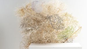‹Kvit tilstand› (‹From the beginning to the end›), 2018, ca 40x35x10 cm, rundstrikka tråd, trepinner, strikket opp til ei form.